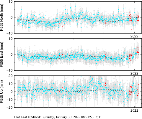 These results are preliminary. The station positions are unchecked and should not be used for any engineering applications. There may be errors in the antenna heights. The velocities are very dependent on the length of the span of observations. The presence of outliers (errant observations) sometimes contaminates the velocities.