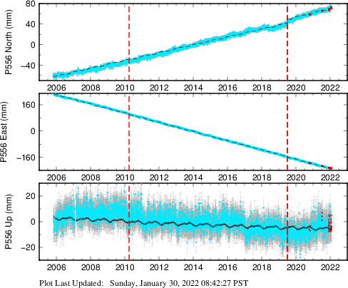 These results are preliminary. The station positions are unchecked and should not be used for any engineering applications. There may be errors in the antenna heights. The velocities are very dependent on the length of the span of observations. The presence of outliers (errant observations) sometimes contaminates the velocities.
