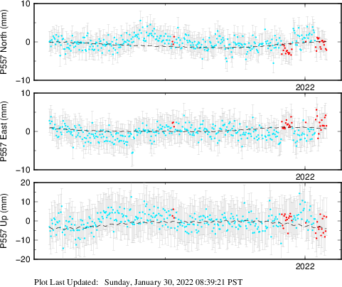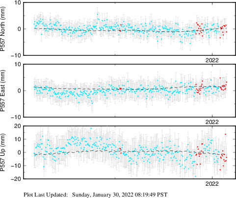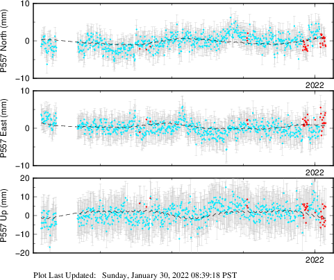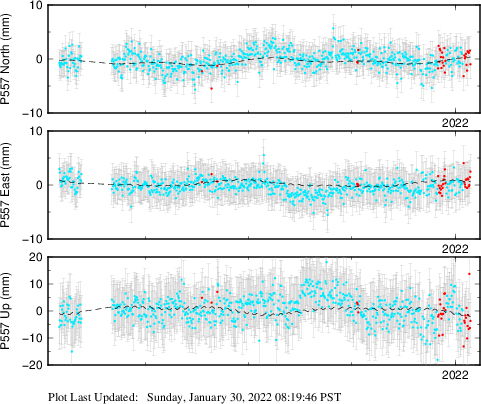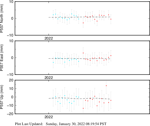 These results are preliminary. The station positions are unchecked and should not be used for any engineering applications. There may be errors in the antenna heights. The velocities are very dependent on the length of the span of observations. The presence of outliers (errant observations) sometimes contaminates the velocities.