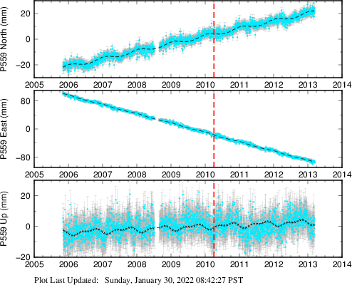| Decimal date | N offset (mm) | N uncertainty (mm) | E offset (mm) | E uncertainty (mm) | U offset (mm) | U uncertainty (mm) | Type | Earthquake magnitude | Earthquake information | Distance from epicenter (km) | |