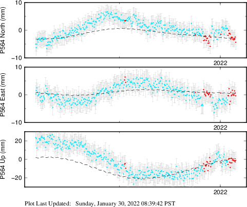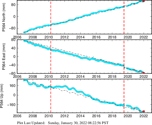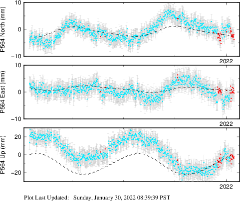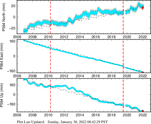 These results are preliminary. The station positions are unchecked and should not be used for any engineering applications. There may be errors in the antenna heights. The velocities are very dependent on the length of the span of observations. The presence of outliers (errant observations) sometimes contaminates the velocities.
