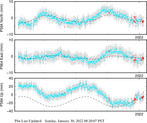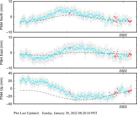 | Decimal date | N log amplitude (mm) | N log amplitude standard deviation (mm) | N time constant (years) | E log amplitude (mm) | E log amplitude standard deviation (mm) | E time constant (years) | U log amplitude (mm) | U log amplitude standard deviation (mm) | U time constant (years) | |