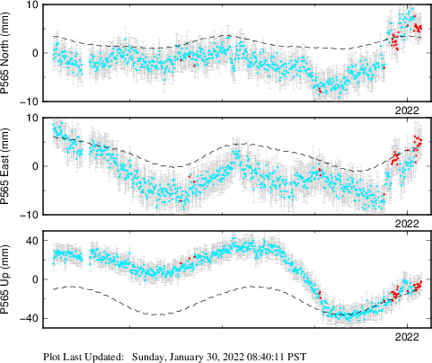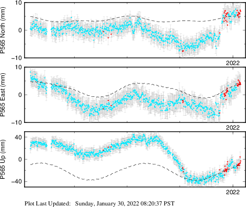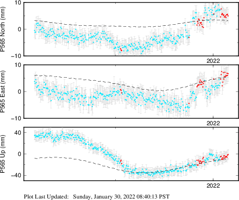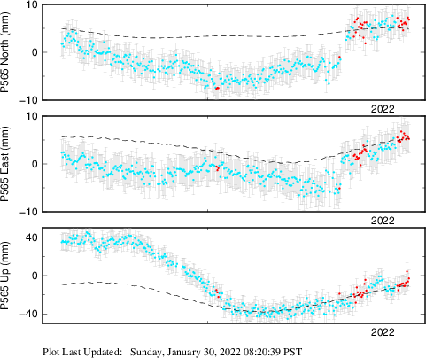 | Decimal date | N log amplitude (mm) | N log amplitude standard deviation (mm) | N time constant (years) | E log amplitude (mm) | E log amplitude standard deviation (mm) | E time constant (years) | U log amplitude (mm) | U log amplitude standard deviation (mm) | U time constant (years) | |