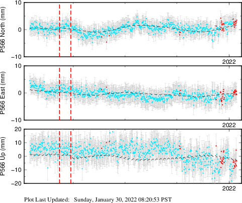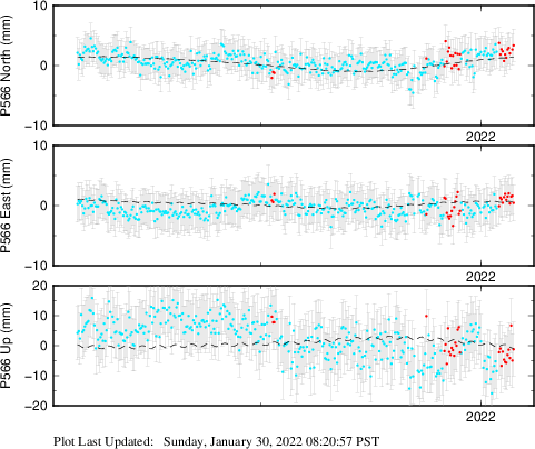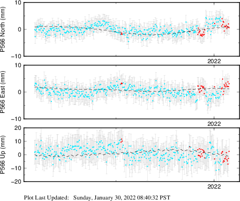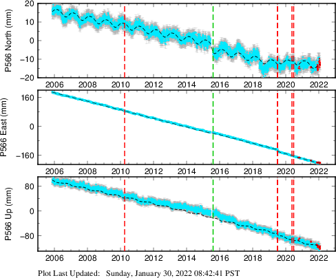These results are preliminary. The station positions are unchecked and should not be used for any engineering applications. There may be errors in the antenna heights. The velocities are very dependent on the length of the span of observations. The presence of outliers (errant observations) sometimes contaminates the velocities.