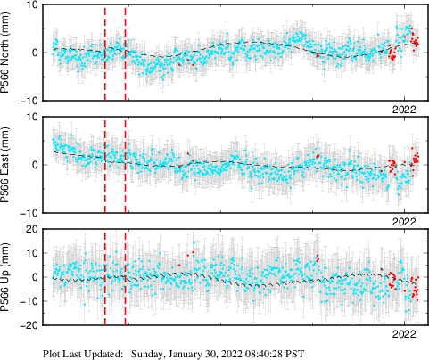 | Decimal date | N log amplitude (mm) | N log amplitude standard deviation (mm) | N time constant (years) | E log amplitude (mm) | E log amplitude standard deviation (mm) | E time constant (years) | U log amplitude (mm) | U log amplitude standard deviation (mm) | U time constant (years) | |