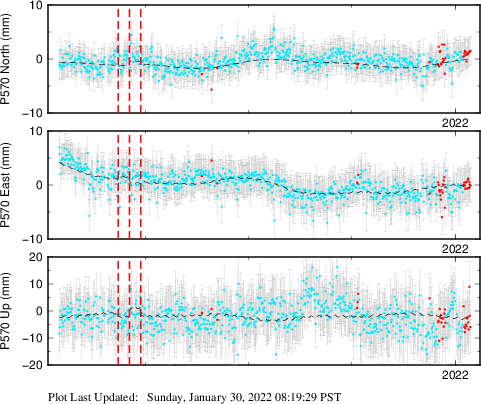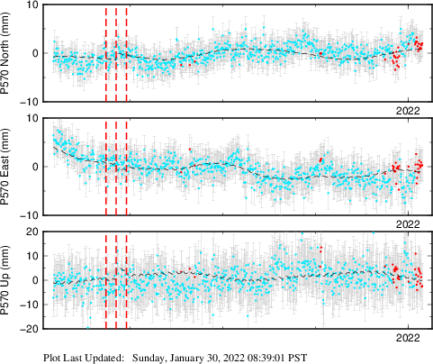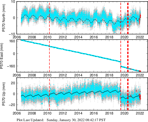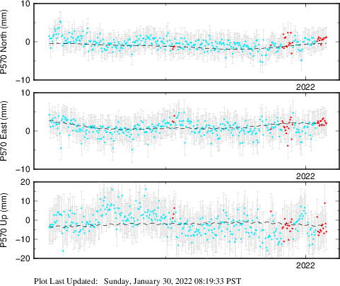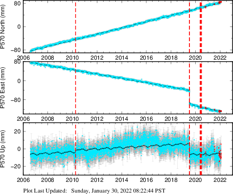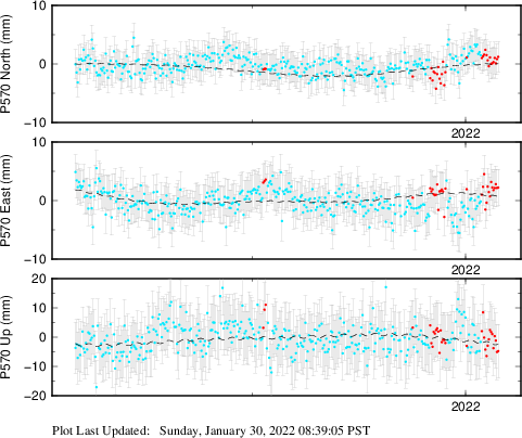 These results are preliminary. The station positions are unchecked and should not be used for any engineering applications. There may be errors in the antenna heights. The velocities are very dependent on the length of the span of observations. The presence of outliers (errant observations) sometimes contaminates the velocities.