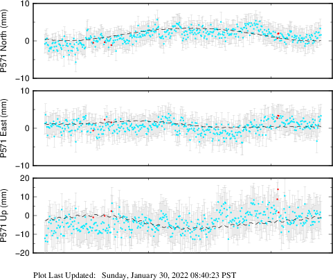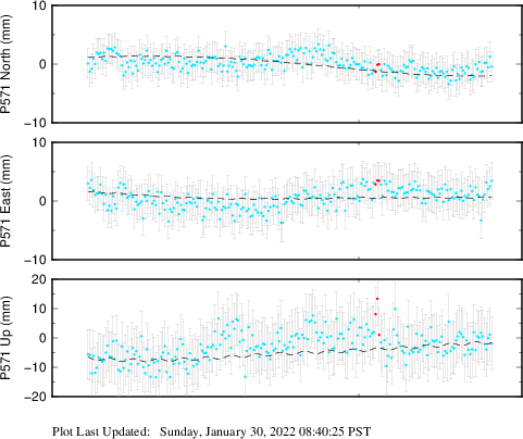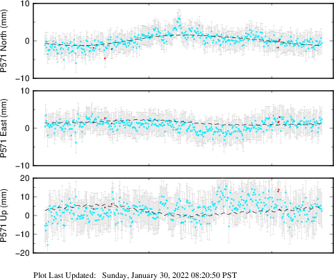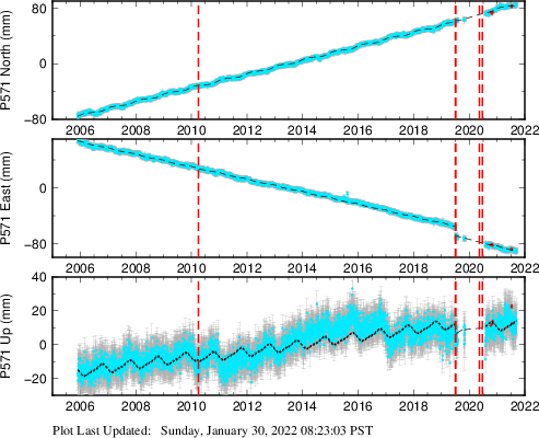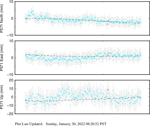 These results are preliminary. The station positions are unchecked and should not be used for any engineering applications. There may be errors in the antenna heights. The velocities are very dependent on the length of the span of observations. The presence of outliers (errant observations) sometimes contaminates the velocities.