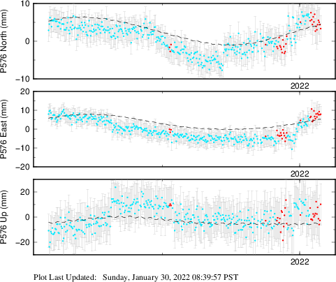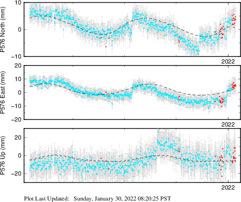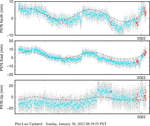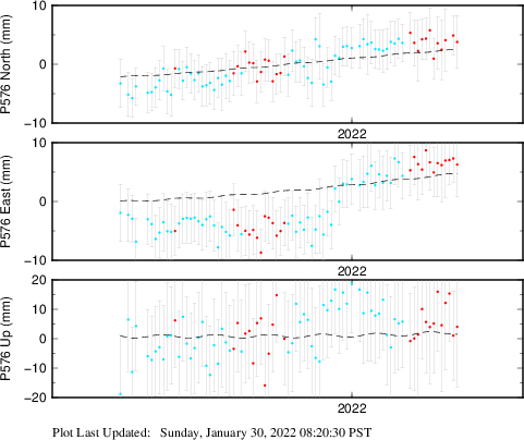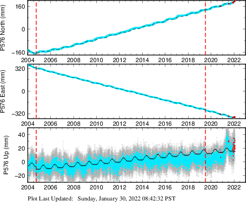 These results are preliminary. The station positions are unchecked and should not be used for any engineering applications. There may be errors in the antenna heights. The velocities are very dependent on the length of the span of observations. The presence of outliers (errant observations) sometimes contaminates the velocities.