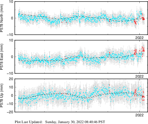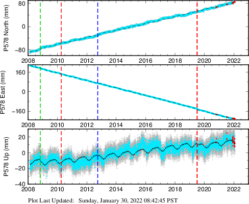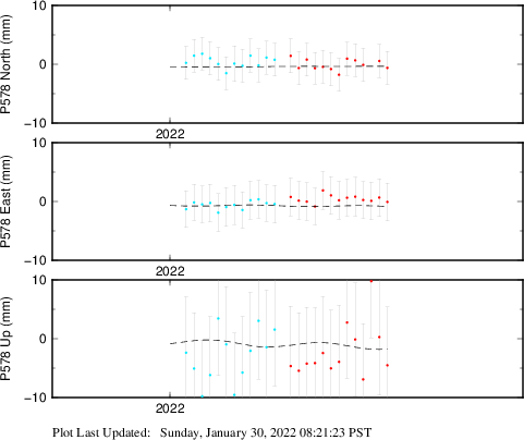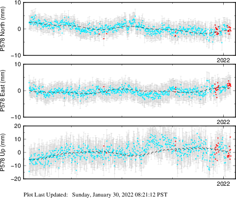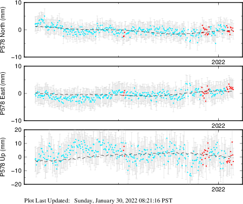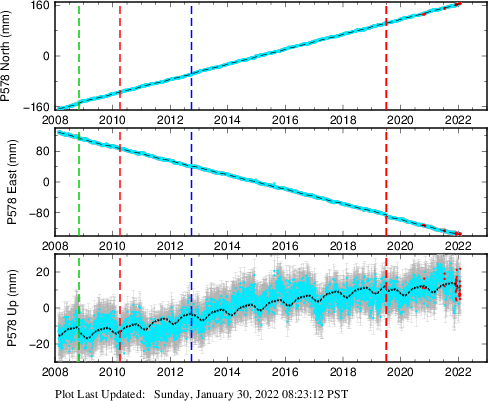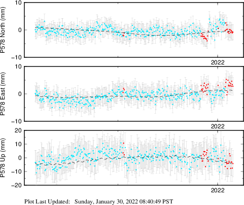 These results are preliminary. The station positions are unchecked and should not be used for any engineering applications. There may be errors in the antenna heights. The velocities are very dependent on the length of the span of observations. The presence of outliers (errant observations) sometimes contaminates the velocities.