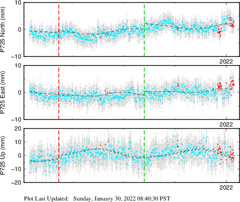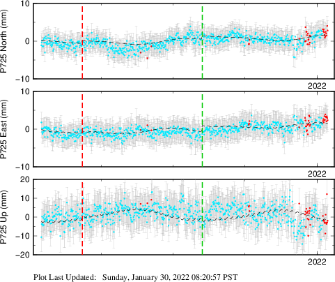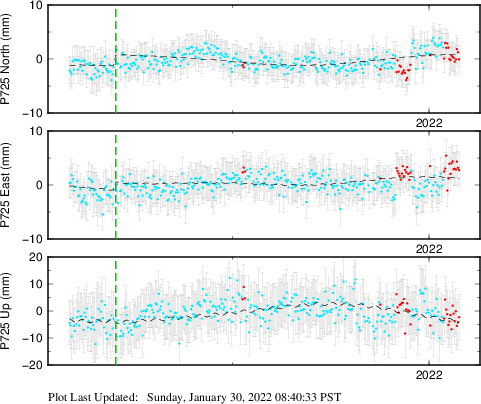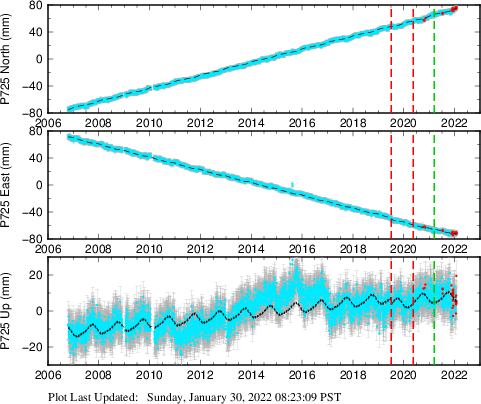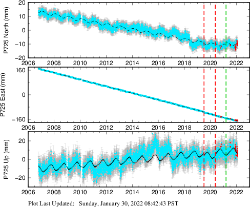 These results are preliminary. The station positions are unchecked and should not be used for any engineering applications. There may be errors in the antenna heights. The velocities are very dependent on the length of the span of observations. The presence of outliers (errant observations) sometimes contaminates the velocities.