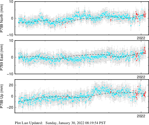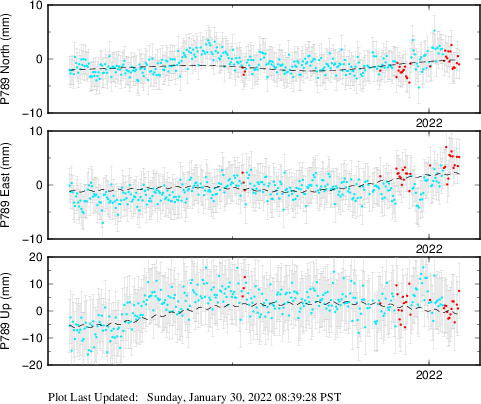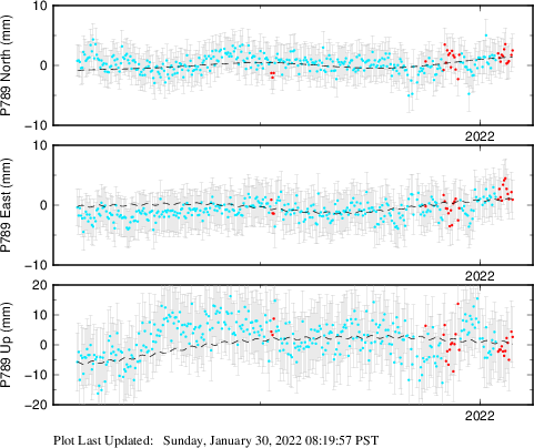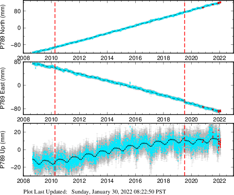 These results are preliminary. The station positions are unchecked and should not be used for any engineering applications. There may be errors in the antenna heights. The velocities are very dependent on the length of the span of observations. The presence of outliers (errant observations) sometimes contaminates the velocities.
