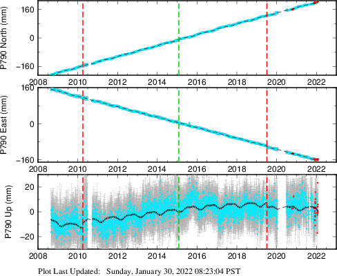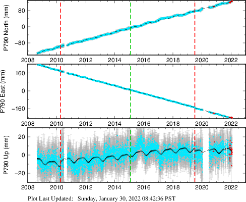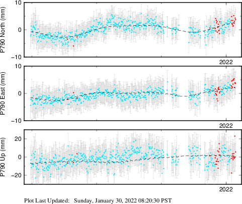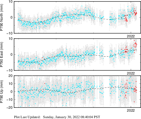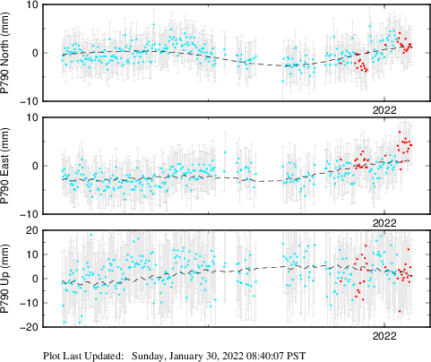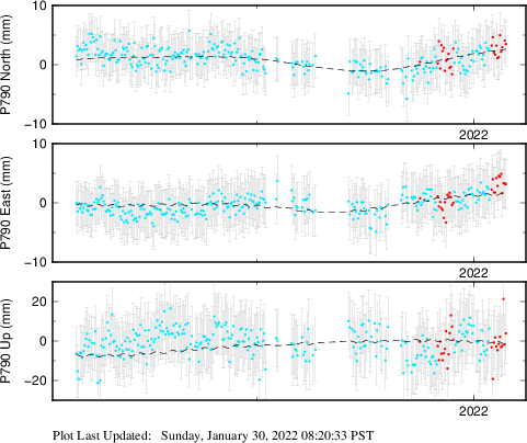 These results are preliminary. The station positions are unchecked and should not be used for any engineering applications. There may be errors in the antenna heights. The velocities are very dependent on the length of the span of observations. The presence of outliers (errant observations) sometimes contaminates the velocities.