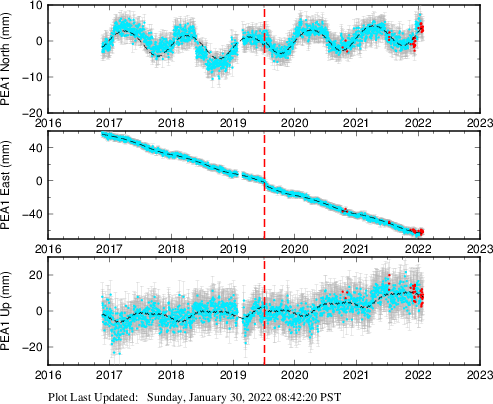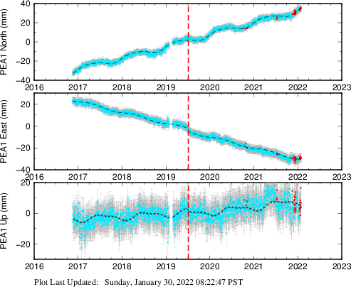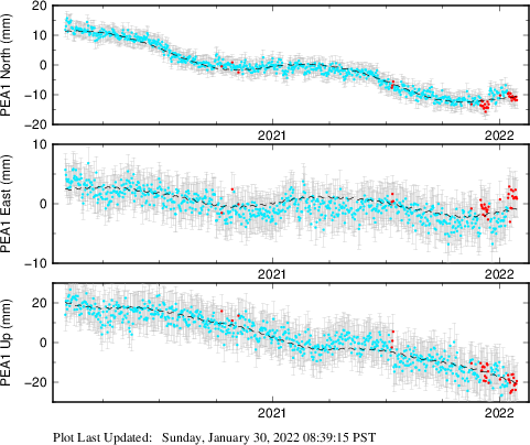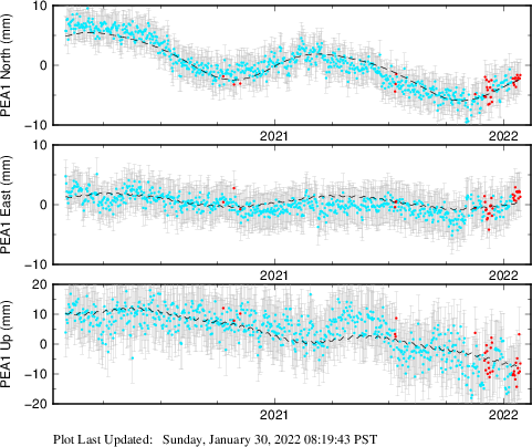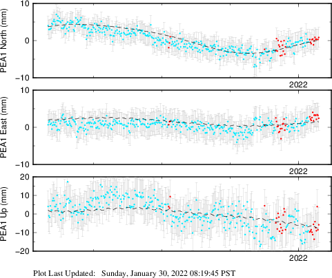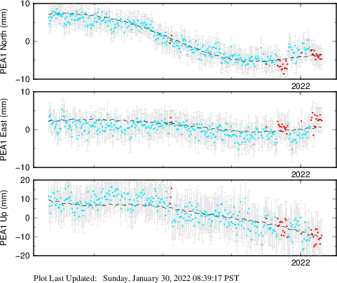 These results are preliminary. The station positions are unchecked and should not be used for any engineering applications. There may be errors in the antenna heights. The velocities are very dependent on the length of the span of observations. The presence of outliers (errant observations) sometimes contaminates the velocities.