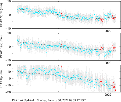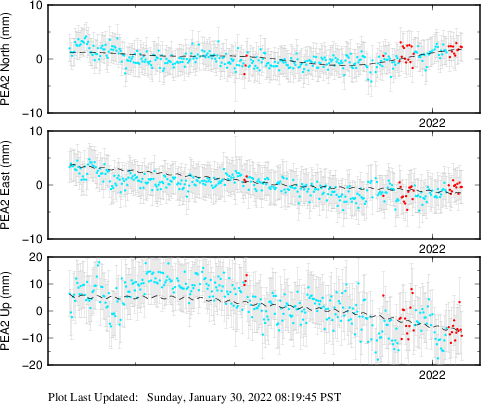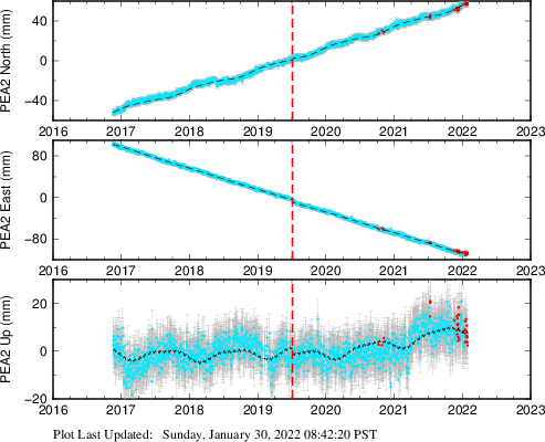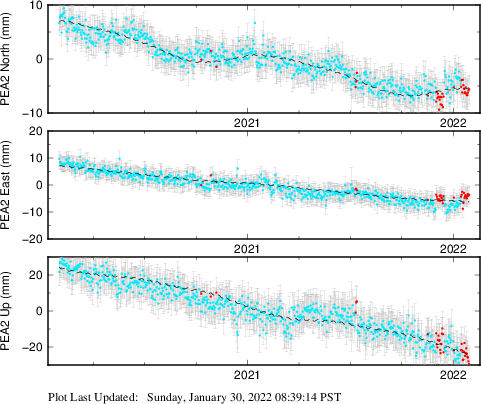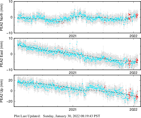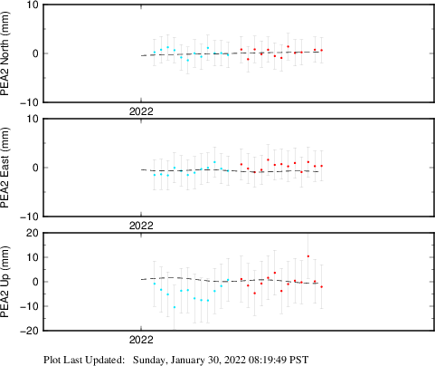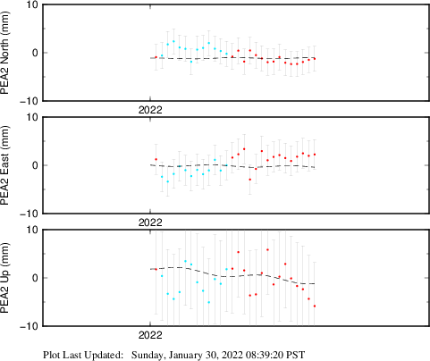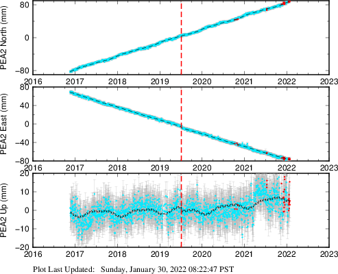 These results are preliminary. The station positions are unchecked and should not be used for any engineering applications. There may be errors in the antenna heights. The velocities are very dependent on the length of the span of observations. The presence of outliers (errant observations) sometimes contaminates the velocities.