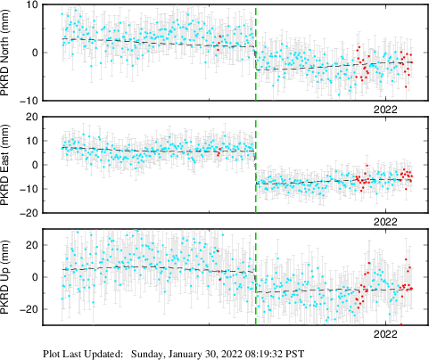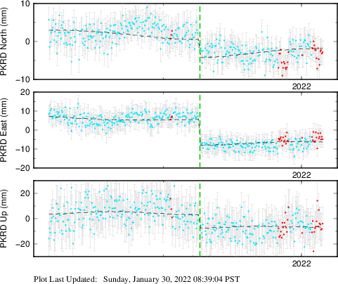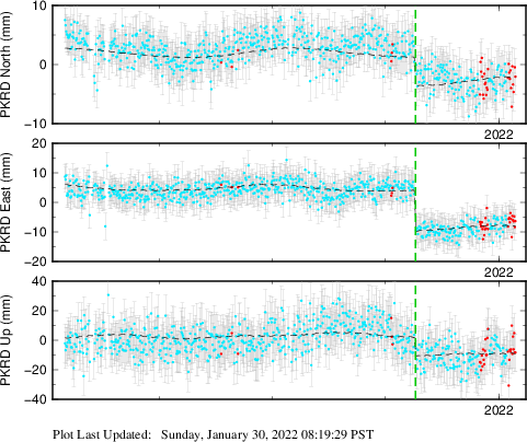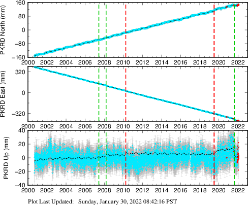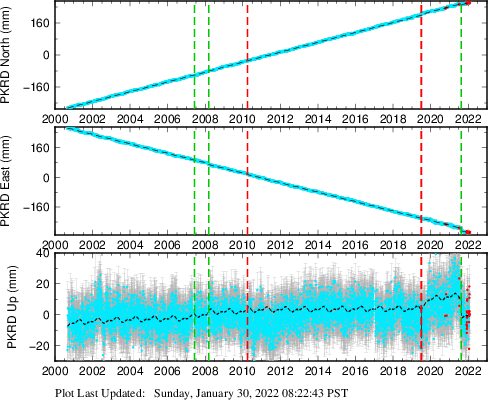These results are preliminary. The station positions are unchecked and should not be used for any engineering applications. There may be errors in the antenna heights. The velocities are very dependent on the length of the span of observations. The presence of outliers (errant observations) sometimes contaminates the velocities.