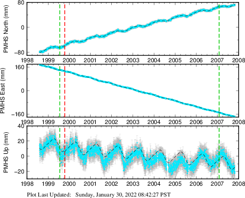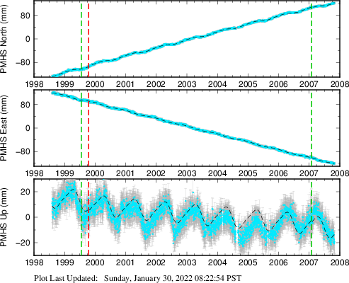 These results are preliminary. The station positions are unchecked and should not be used for any engineering applications. There may be errors in the antenna heights. The velocities are very dependent on the length of the span of observations. The presence of outliers (errant observations) sometimes contaminates the velocities.
