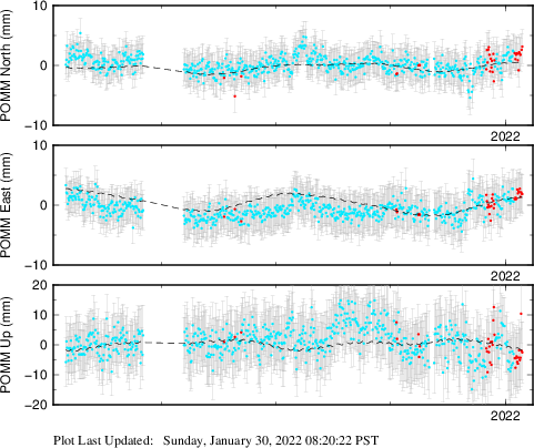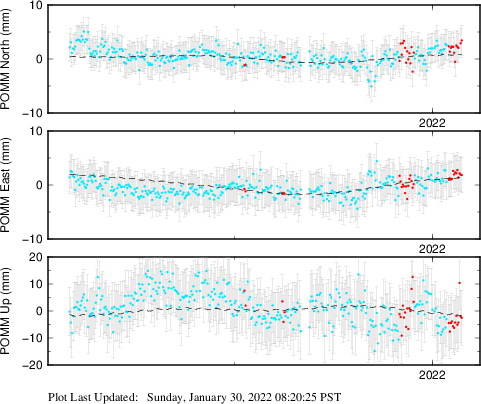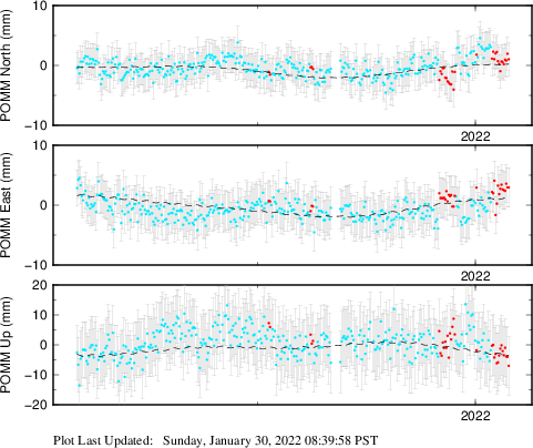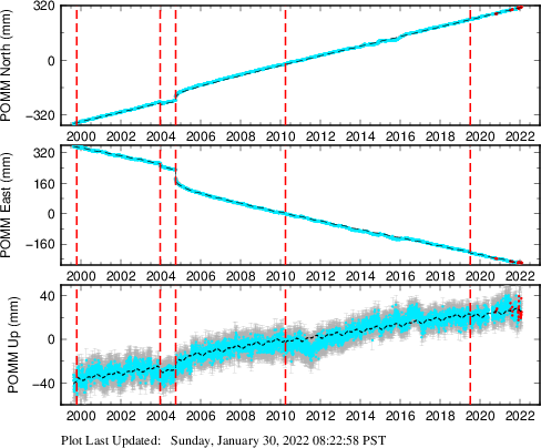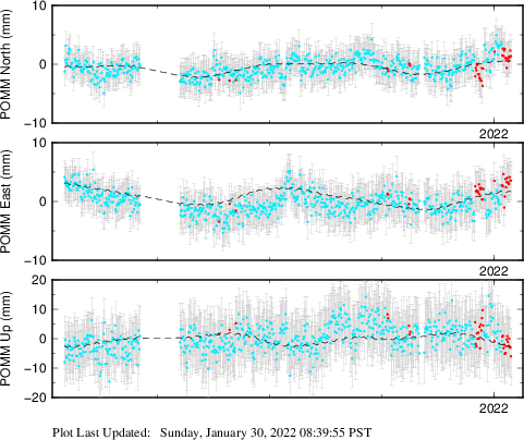 These results are preliminary. The station positions are unchecked and should not be used for any engineering applications. There may be errors in the antenna heights. The velocities are very dependent on the length of the span of observations. The presence of outliers (errant observations) sometimes contaminates the velocities.
