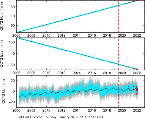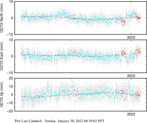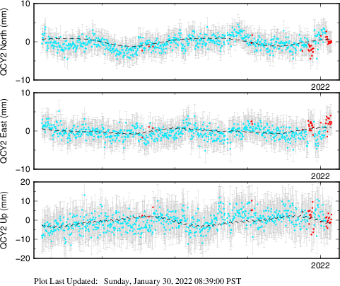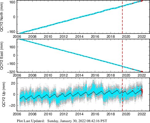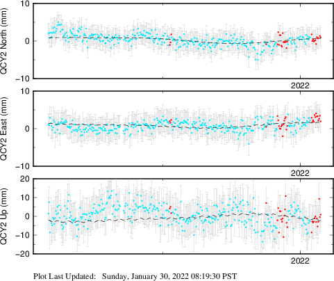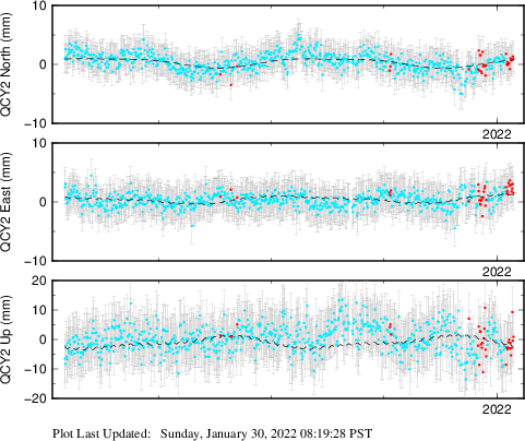 These results are preliminary. The station positions are unchecked and should not be used for any engineering applications. There may be errors in the antenna heights. The velocities are very dependent on the length of the span of observations. The presence of outliers (errant observations) sometimes contaminates the velocities.