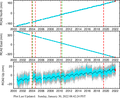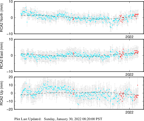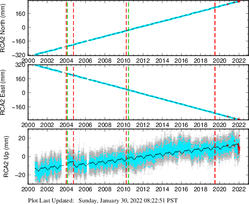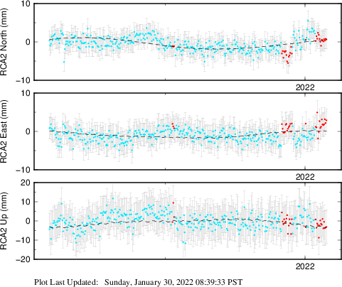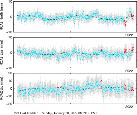 These results are preliminary. The station positions are unchecked and should not be used for any engineering applications. There may be errors in the antenna heights. The velocities are very dependent on the length of the span of observations. The presence of outliers (errant observations) sometimes contaminates the velocities.