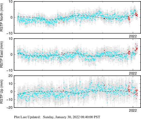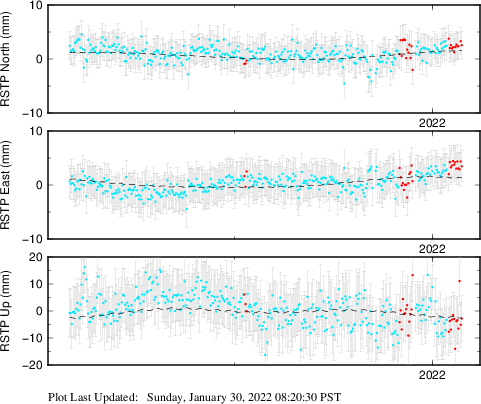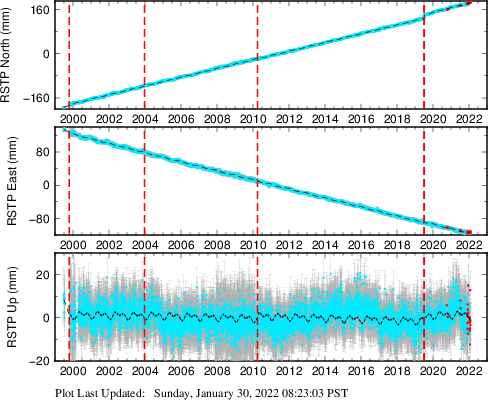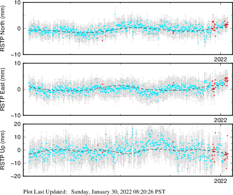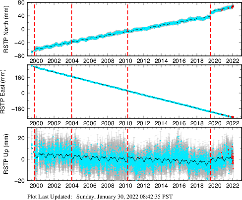 These results are preliminary. The station positions are unchecked and should not be used for any engineering applications. There may be errors in the antenna heights. The velocities are very dependent on the length of the span of observations. The presence of outliers (errant observations) sometimes contaminates the velocities.
