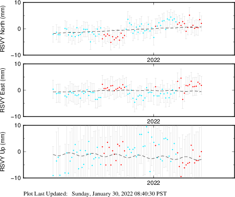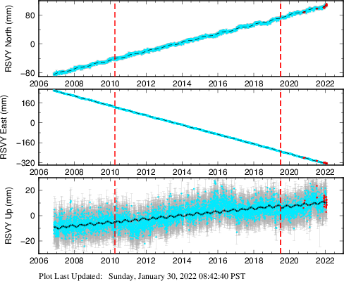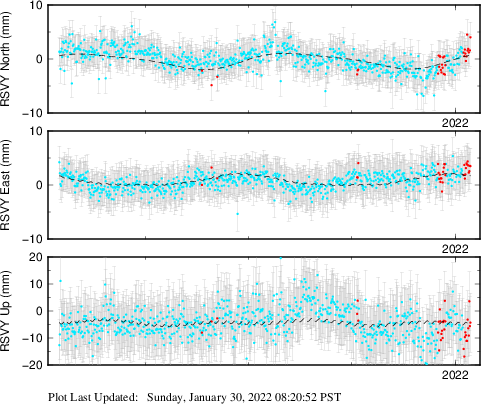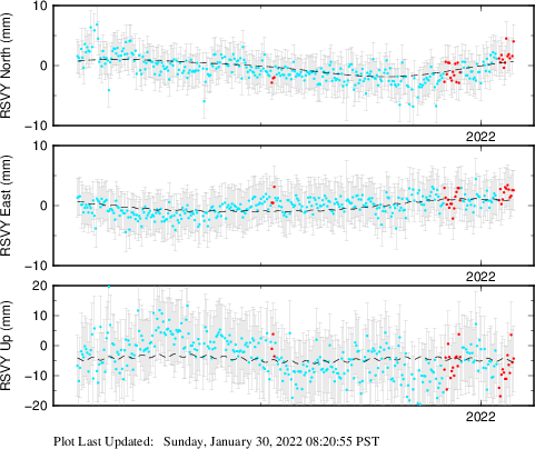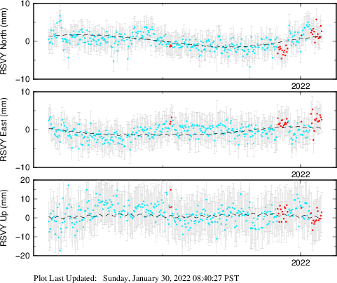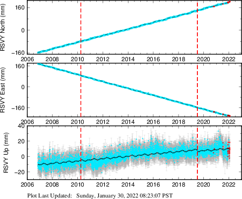 These results are preliminary. The station positions are unchecked and should not be used for any engineering applications. There may be errors in the antenna heights. The velocities are very dependent on the length of the span of observations. The presence of outliers (errant observations) sometimes contaminates the velocities.