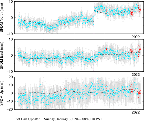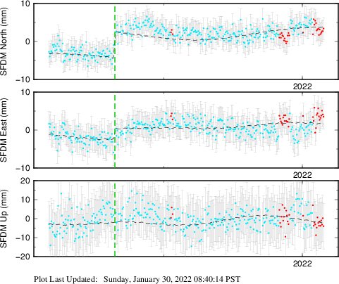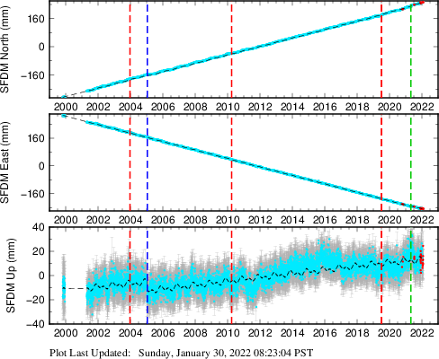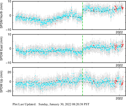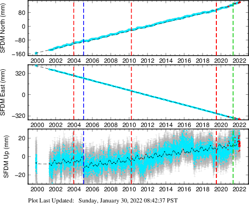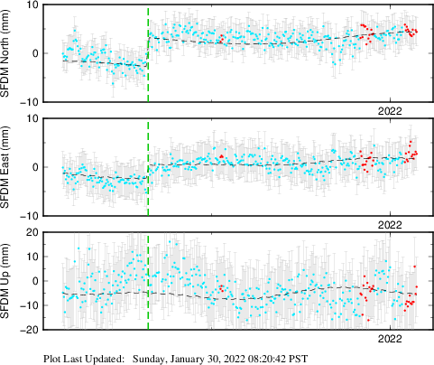 These results are preliminary. The station positions are unchecked and should not be used for any engineering applications. There may be errors in the antenna heights. The velocities are very dependent on the length of the span of observations. The presence of outliers (errant observations) sometimes contaminates the velocities.