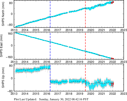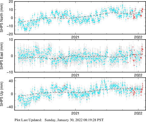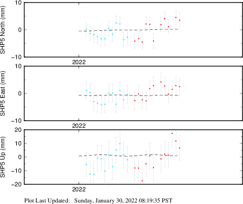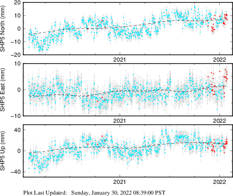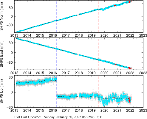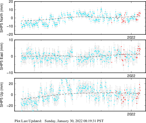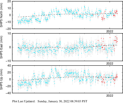 These results are preliminary. The station positions are unchecked and should not be used for any engineering applications. There may be errors in the antenna heights. The velocities are very dependent on the length of the span of observations. The presence of outliers (errant observations) sometimes contaminates the velocities.