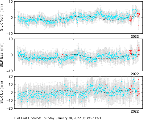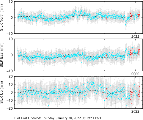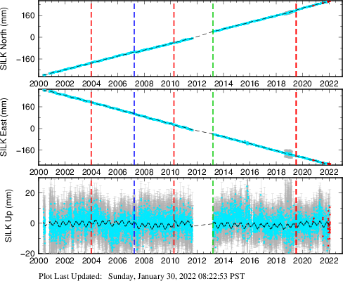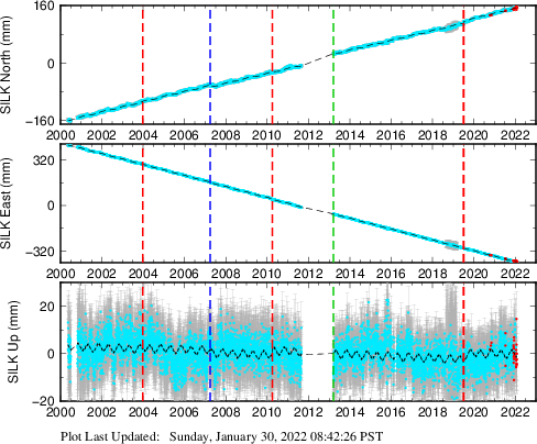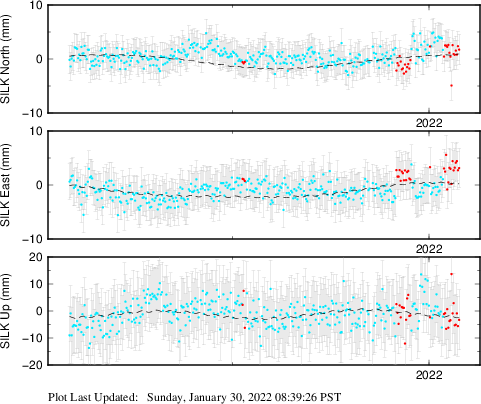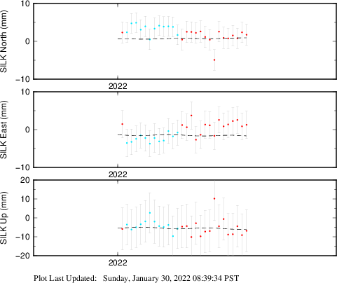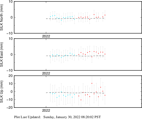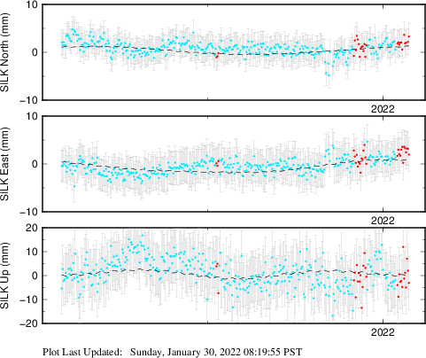These results are preliminary. The station positions are unchecked and should not be used for any engineering applications. There may be errors in the antenna heights. The velocities are very dependent on the length of the span of observations. The presence of outliers (errant observations) sometimes contaminates the velocities.