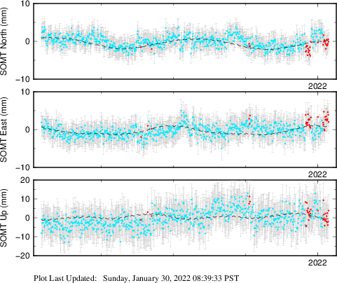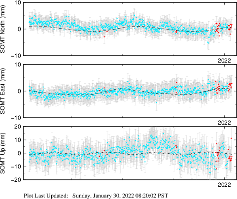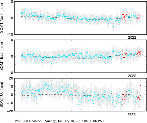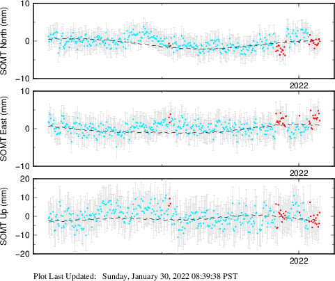 These results are preliminary. The station positions are unchecked and should not be used for any engineering applications. There may be errors in the antenna heights. The velocities are very dependent on the length of the span of observations. The presence of outliers (errant observations) sometimes contaminates the velocities.
