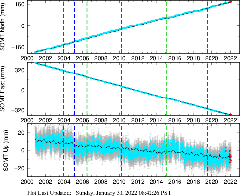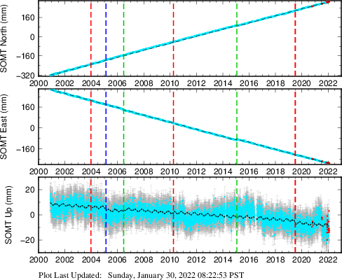 | Decimal date | N offset (mm) | N uncertainty (mm) | E offset (mm) | E uncertainty (mm) | U offset (mm) | U uncertainty (mm) | Type | Earthquake magnitude | Earthquake information | Distance from epicenter (km) | |