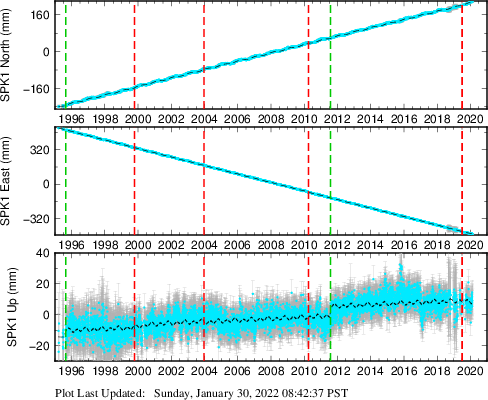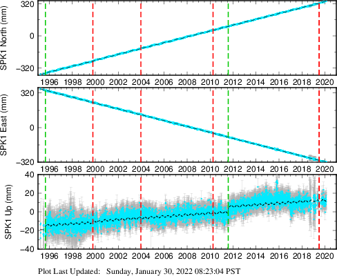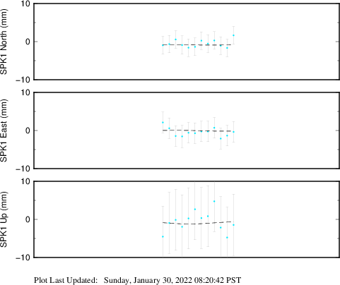 These results are preliminary. The station positions are unchecked and should not be used for any engineering applications. There may be errors in the antenna heights. The velocities are very dependent on the length of the span of observations. The presence of outliers (errant observations) sometimes contaminates the velocities.