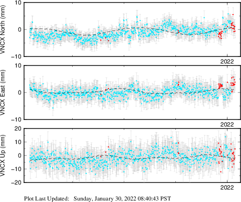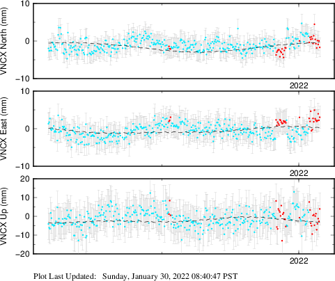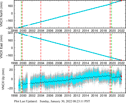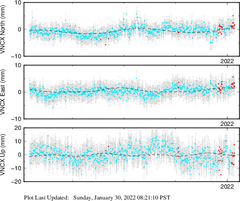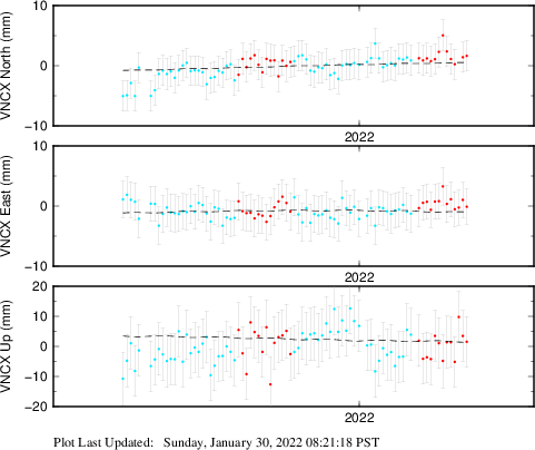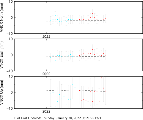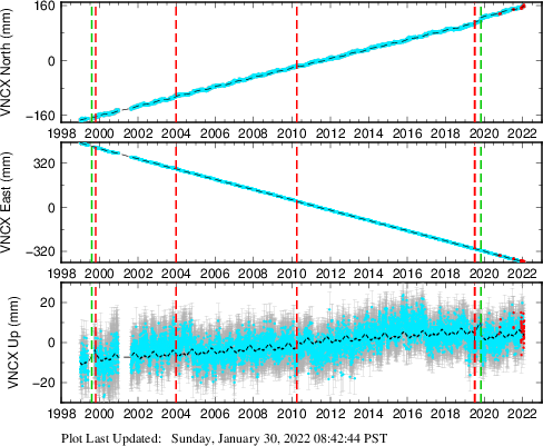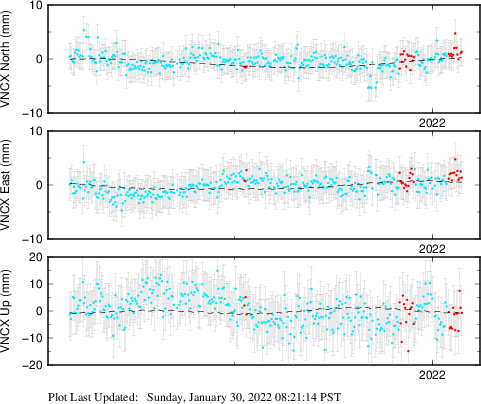 These results are preliminary. The station positions are unchecked and should not be used for any engineering applications. There may be errors in the antenna heights. The velocities are very dependent on the length of the span of observations. The presence of outliers (errant observations) sometimes contaminates the velocities.