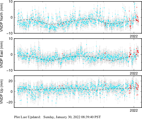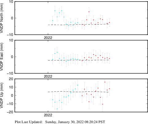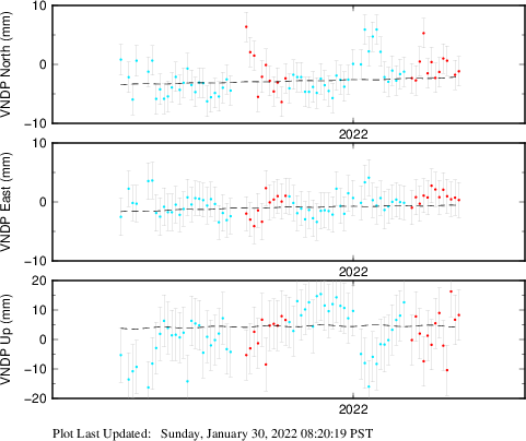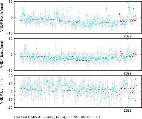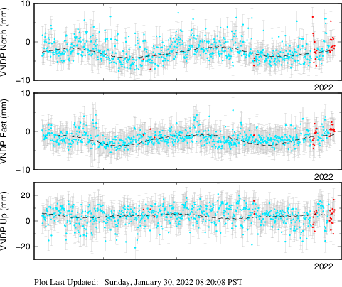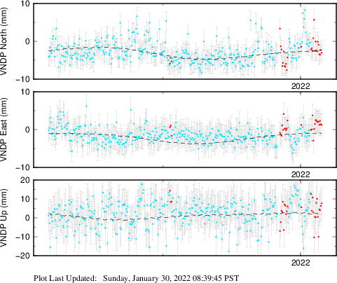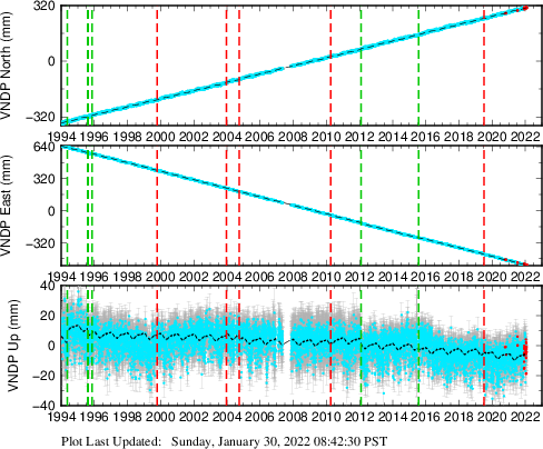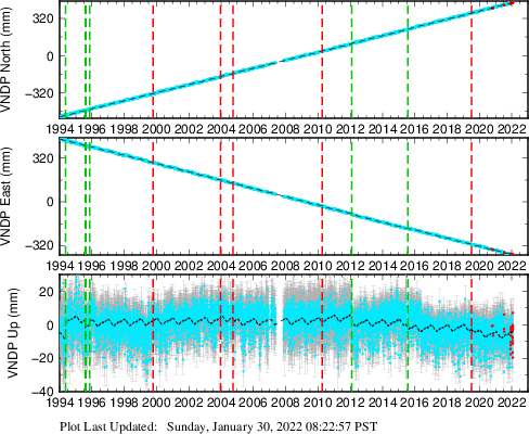 These results are preliminary. The station positions are unchecked and should not be used for any engineering applications. There may be errors in the antenna heights. The velocities are very dependent on the length of the span of observations. The presence of outliers (errant observations) sometimes contaminates the velocities.