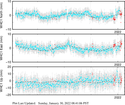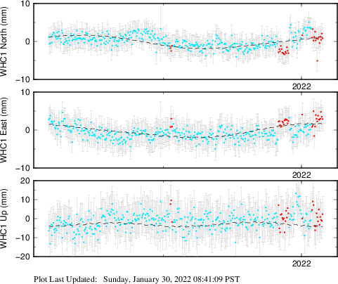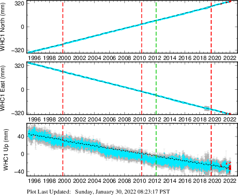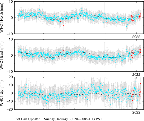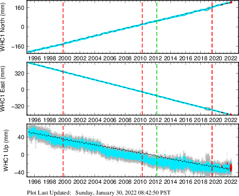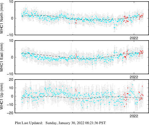 These results are preliminary. The station positions are unchecked and should not be used for any engineering applications. There may be errors in the antenna heights. The velocities are very dependent on the length of the span of observations. The presence of outliers (errant observations) sometimes contaminates the velocities.