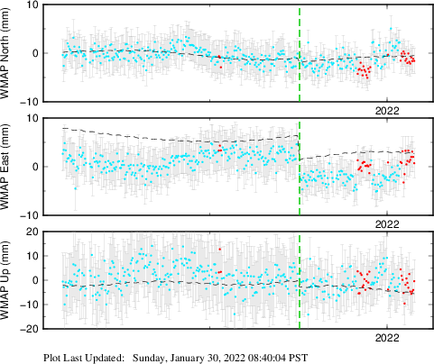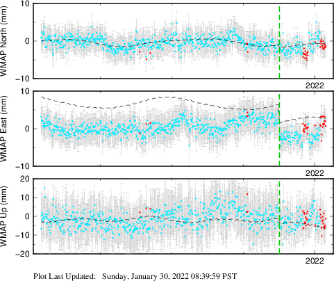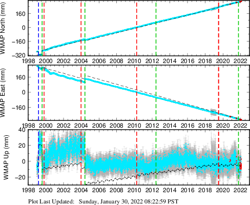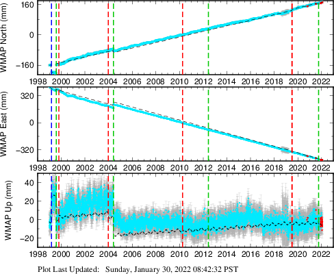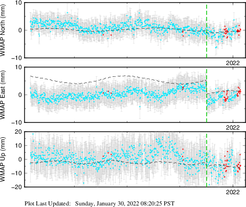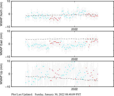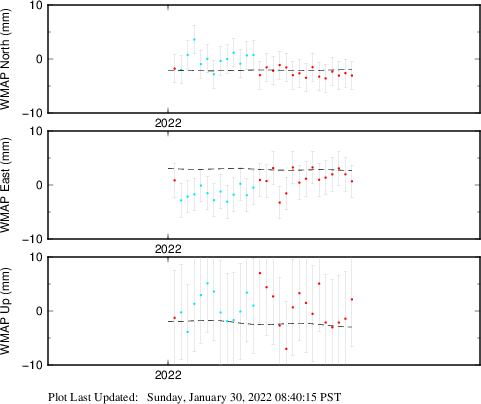 These results are preliminary. The station positions are unchecked and should not be used for any engineering applications. There may be errors in the antenna heights. The velocities are very dependent on the length of the span of observations. The presence of outliers (errant observations) sometimes contaminates the velocities.
